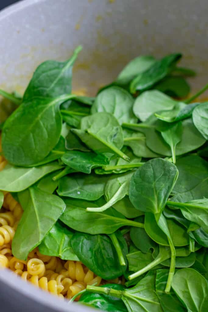 - When the pasta is just about fully cooked, stir in your spinach and stir until it wilts.